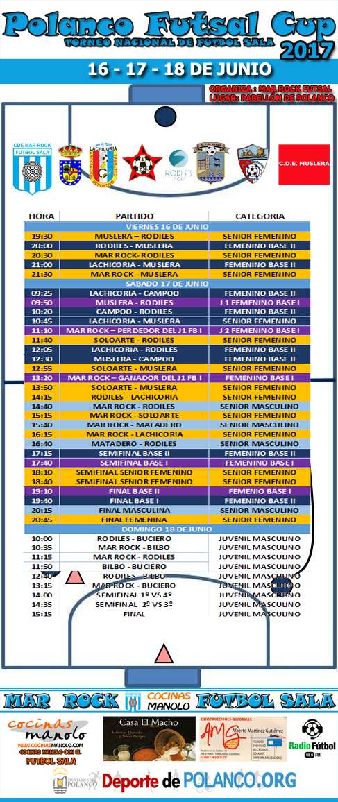 Desde el viernes 16 hasta el domingo 18 de junio, podremos disfrutar de la Polanco Futsal Cup 2017, convirtiéndose Polanco en el centro del Futsal este próximo fin de semana, donde tendremos a 19 equipos con unos 200 jugadores y jugadoras repartidos en las distintas categorías, femenino base I y II, juvenil masculino, sénior masculino y femenino. Entre los equipos inscritos encontramos a los cántabros Muslera, Lachicoria, Campoo de Enmedio, Buciero Santoña, Matadero Reinosa, el Rodiles FS de Villavicosa Asturias o los vizcaínos Bilbo FS y las chicas de Basauri el Soloarte FS.